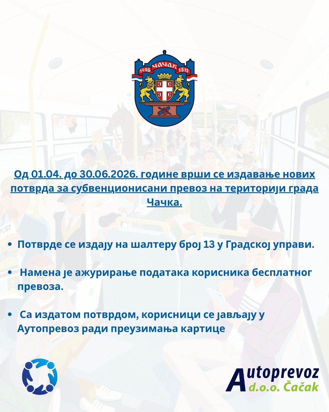 У периоду од 1.4.2026. године до 30.6.2026. године врши се пријем захтева и издавање потврда о поднетом захтеву за остваривање права на бесплатан / превоз са попустом у градском и приградском превозу на територији града Чачка.